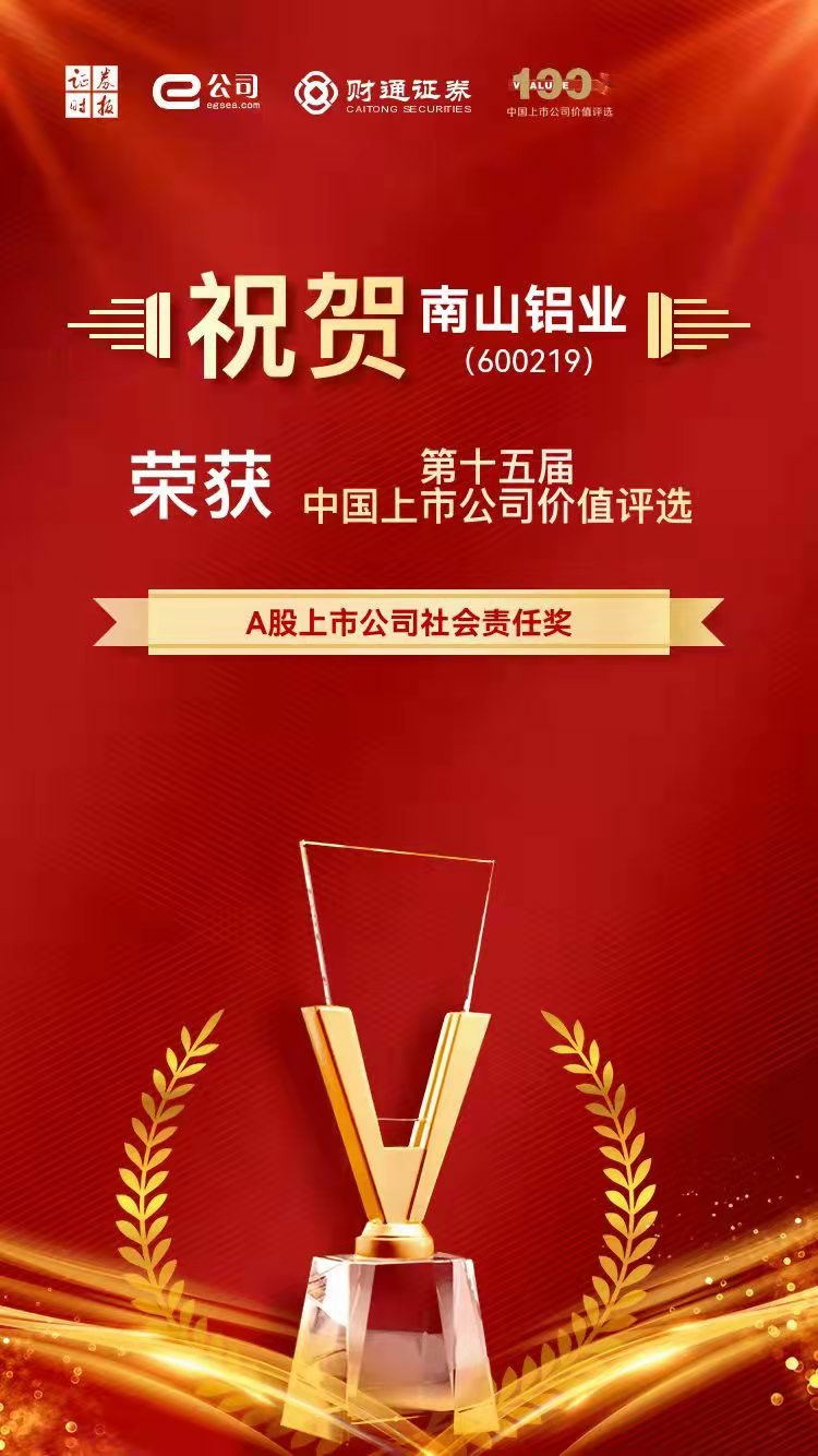 9月28日,由證券時報社主辦、財通證券特約協辦的“第十五屆中國上市公司價值評選”榜單揭曉,南山鋁業榮獲“A股上市公司社會責任獎”。
